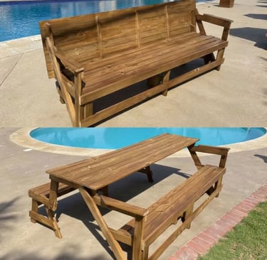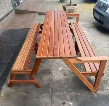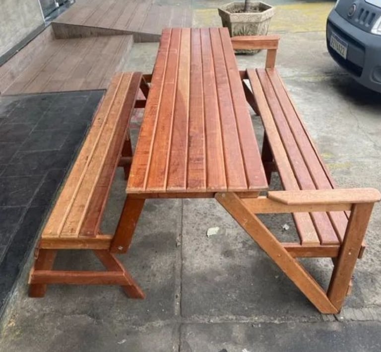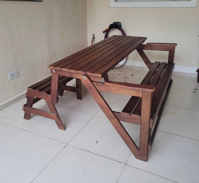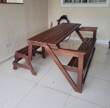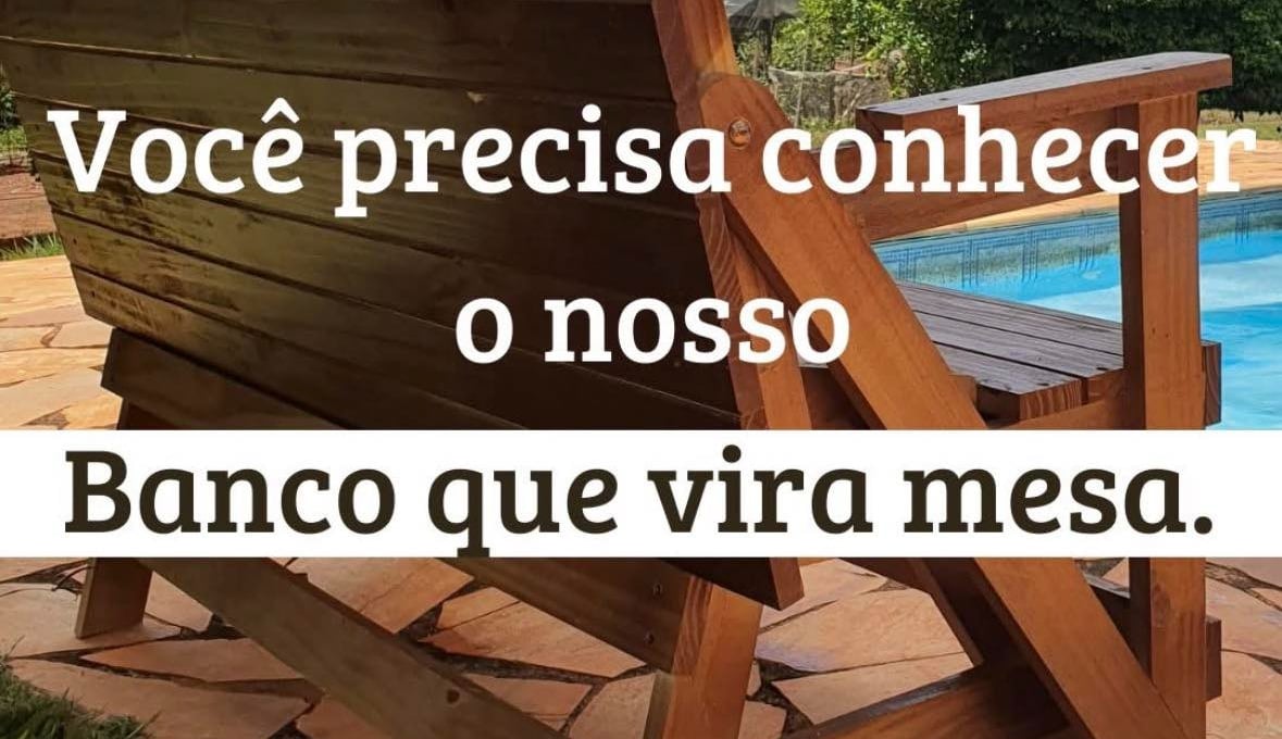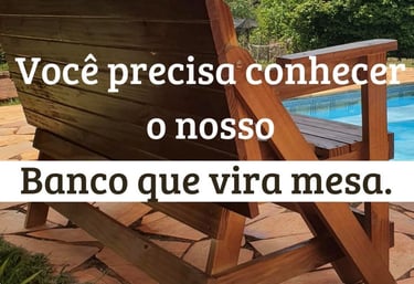 O banco que vira mesa, perfeito para reunir até oito pessoas com praticidade e estilo, dentro ou fora de casa.